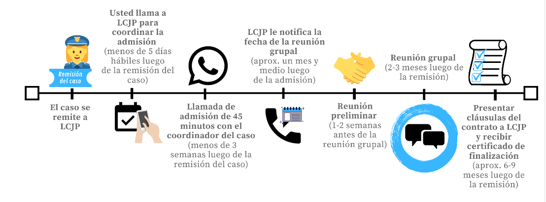 El coordinador de casos de LCJP le preguntará si quiere ser parte del proceso o no, y en qué medida, y trabajará con usted para encontrar la solución que mejor se adapte a su caso.